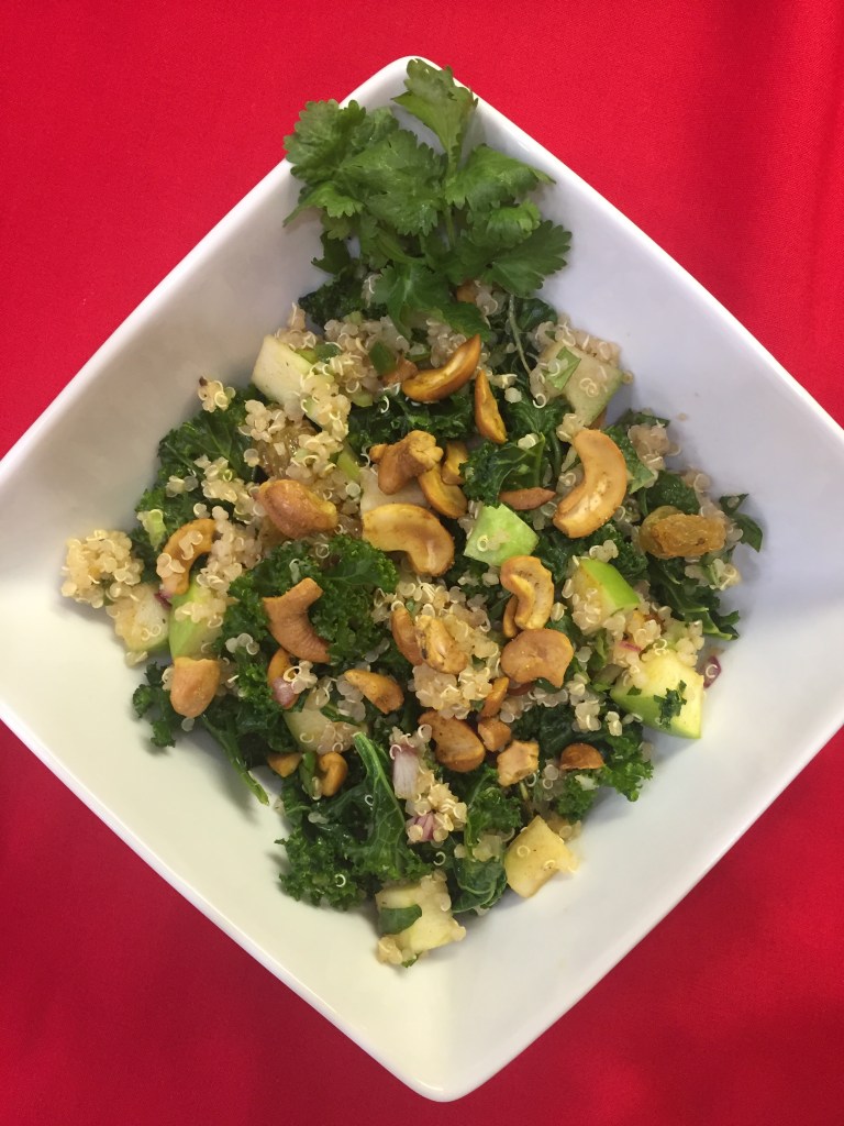 This salad is a delicious mix of flavors and textures. The fragrant curry mixed with the scent of cilantro and mint create an appetizing aroma. Tartness from the green apple, combined with the citrus from the lime were complemented by the sweet mint and blend of spices in the garam masala. The texture combined a crisp crunch from the celery, apple and cashews with a mix of softer bites from the raisins and quinoa. A delicious and healthy salad to make again and again!