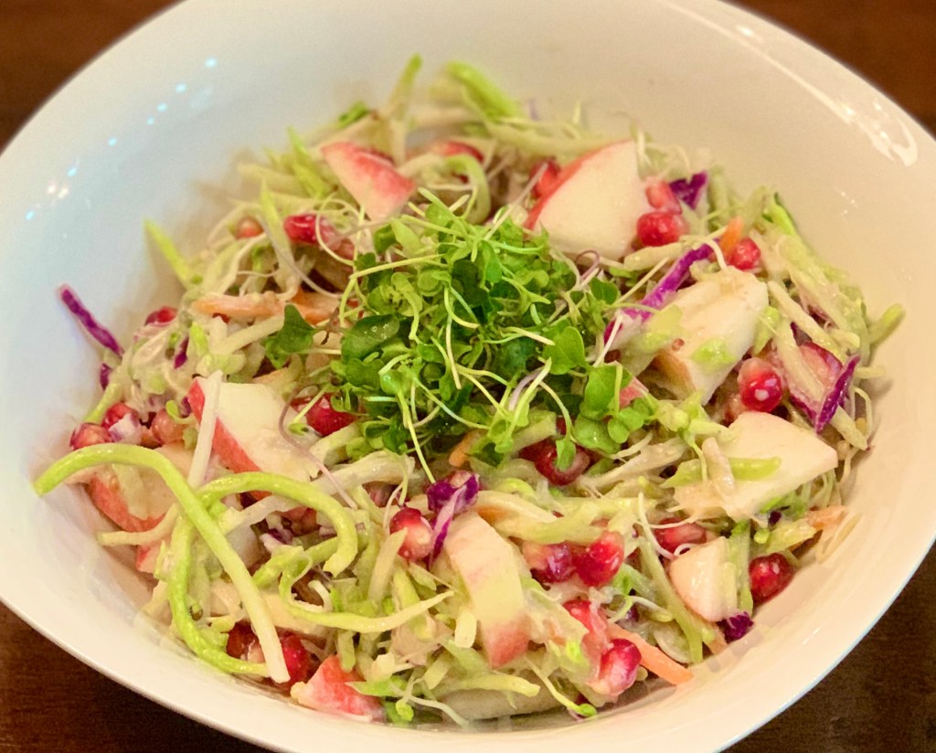 Combine the following and then mix in dressing to coat slaw ingredients. Garnish with broccoli microgreens.