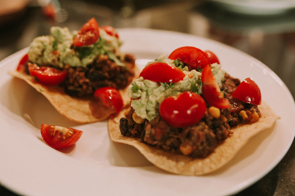 Place mixture a top tostadas (or just serve solo on plate) and garnish with sliced avocado or guacamole, cherry tomatoes and cilantro.