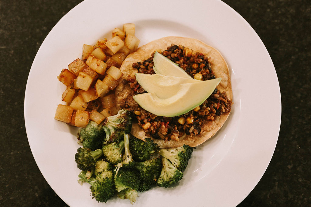 The first night I prepared Mexican lentil, black bean and rice tostadas with roasted broccoli and plant based cheese sauce and diced potatoes sautéed in vegetable broth. I felt like this was a good meal to start with because it looked kind of like a “meat and potatoes” meal on the plate but with lots of flavor and color. The verdict? The fellows really enjoyed it and couldn’t believe it was healthy!